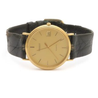 Utropspris: 8 400 krHERRUR TISSOT ø 33MM, DATUM, QUARTZ, LÄDERBAND / 18K GULD I BOETTEN TOTALVIKT: 29,9G – OBS! LÄNKEN ÄR SLITEN, GRAVYR PÅ BAKSIDAN