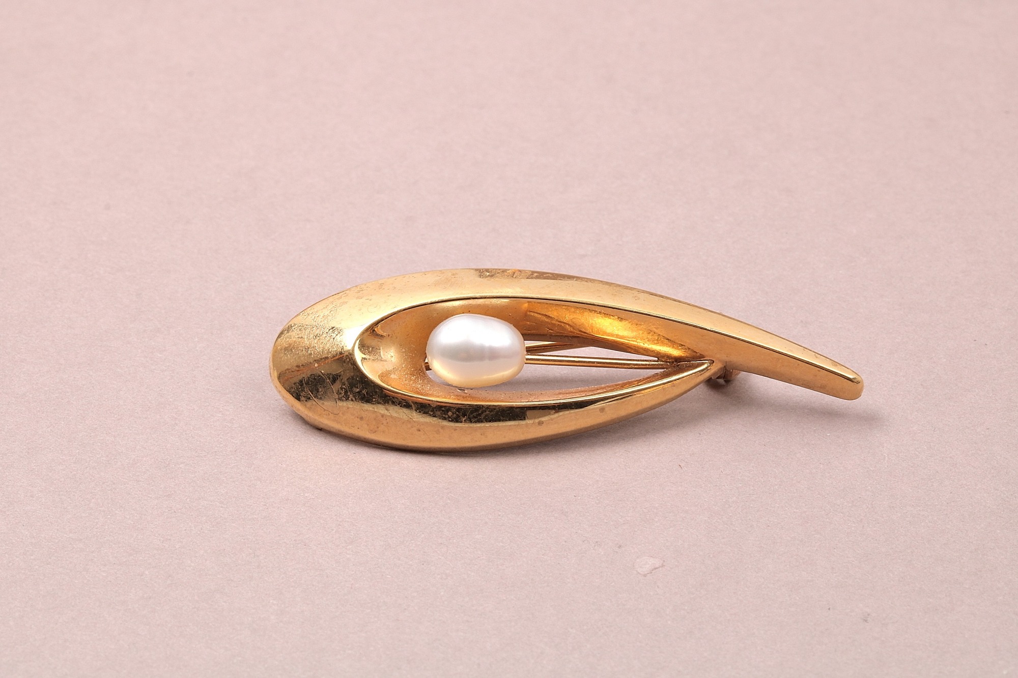 BROSCH MED SÖTVATTENSPÄRLA. L 4,8 CM, TILLV. 1955
