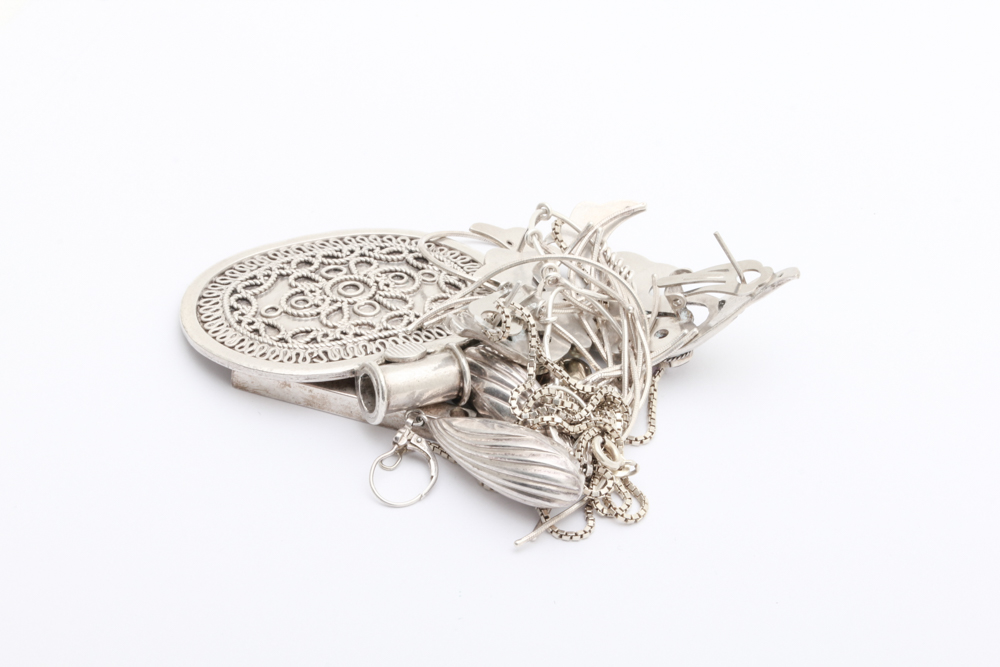 DEFEKTA SMYCKEN I 800-925 SILVER, PRYDNADSSTENAR, PÄRLOR, LÅS I METALL, MISSFÄRGNINGAR, BUCKLOR, REPOR OCH NAGG – TOTALVIKT: