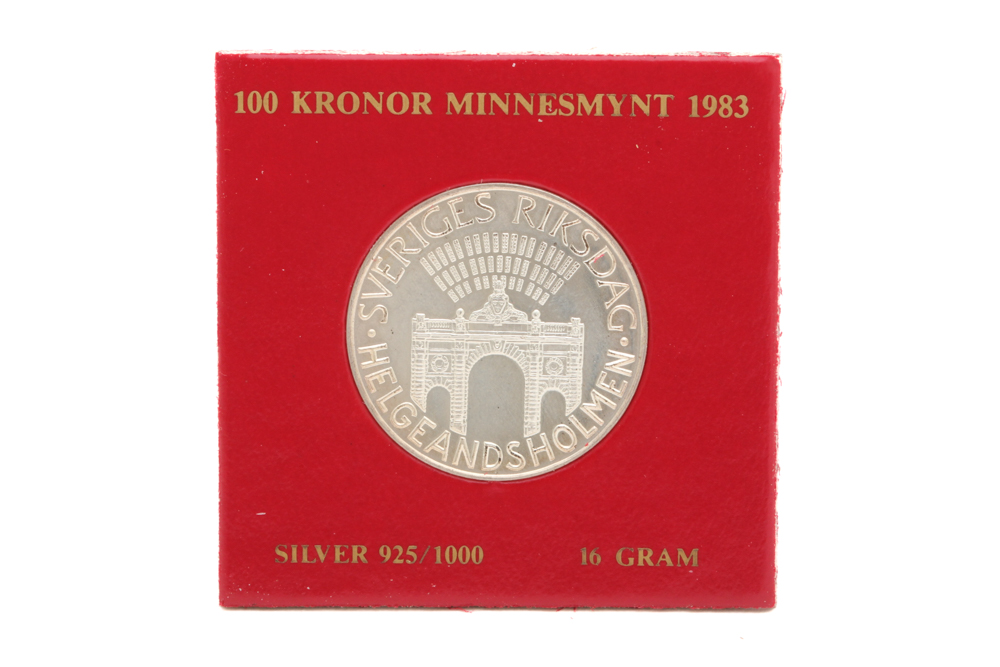 MINNESMYNT 100KR SVERIGES RIKSDAG HELGEANDSHOLMEN I ETUI / 925 SILVER 16G – OBS! ETUIET ÄR TRASIGT